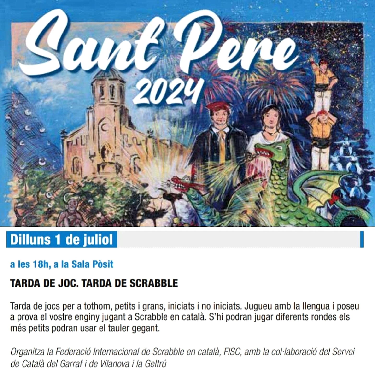 El Servei de Català del Garraf i de Vilanova i la Geltrú, conjuntament amb la Federació Internacional de Scrabble en Català (FISC), van col·laborar per primera vegada amb una activitat lúdica: "Tarda de joc. Tarda de Scrabble", dins del programa d'activitats de les Festes de Sant Pere que organitza la Confraria de Pescadors de Vilanova.