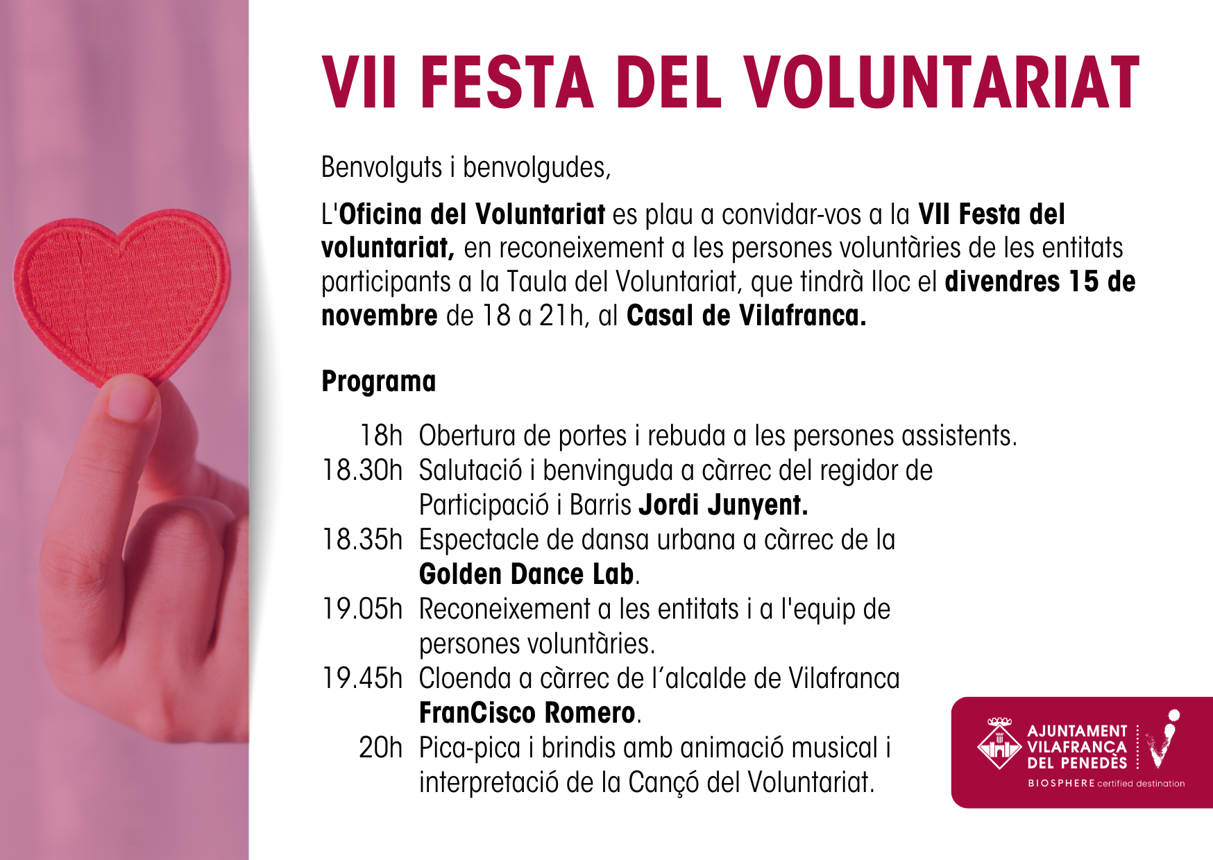 La benvinguda va anar a càrrec del regidor de Participació i Barris de l'Ajuntament de Vilafranca, Jordi Junyent, i la cloenda la va fer l'alcalde de la vila, Francisco Romero. Tots dos van reconèixer i van agrair la tasca social que fan totes les persones voluntàries que participen en diferents entitats vilafranquines. L'agraïment es va materialitzar amb un obsequi que van rebre tots els assistents.