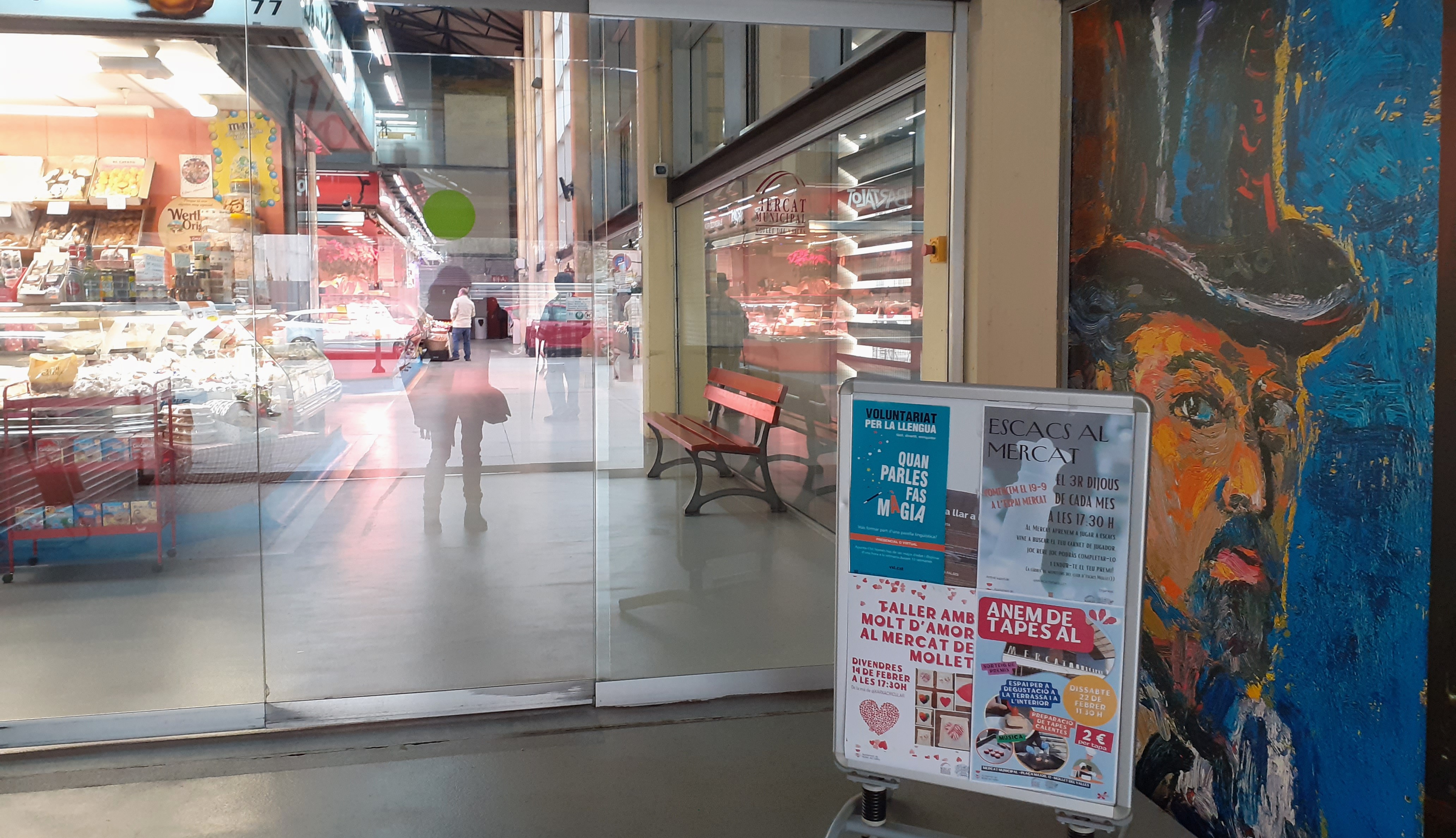 Només entrar al Mercat, es veu el cartell del Voluntariat per la llengua que convida a visitar l’Espai Menut del Mercat.