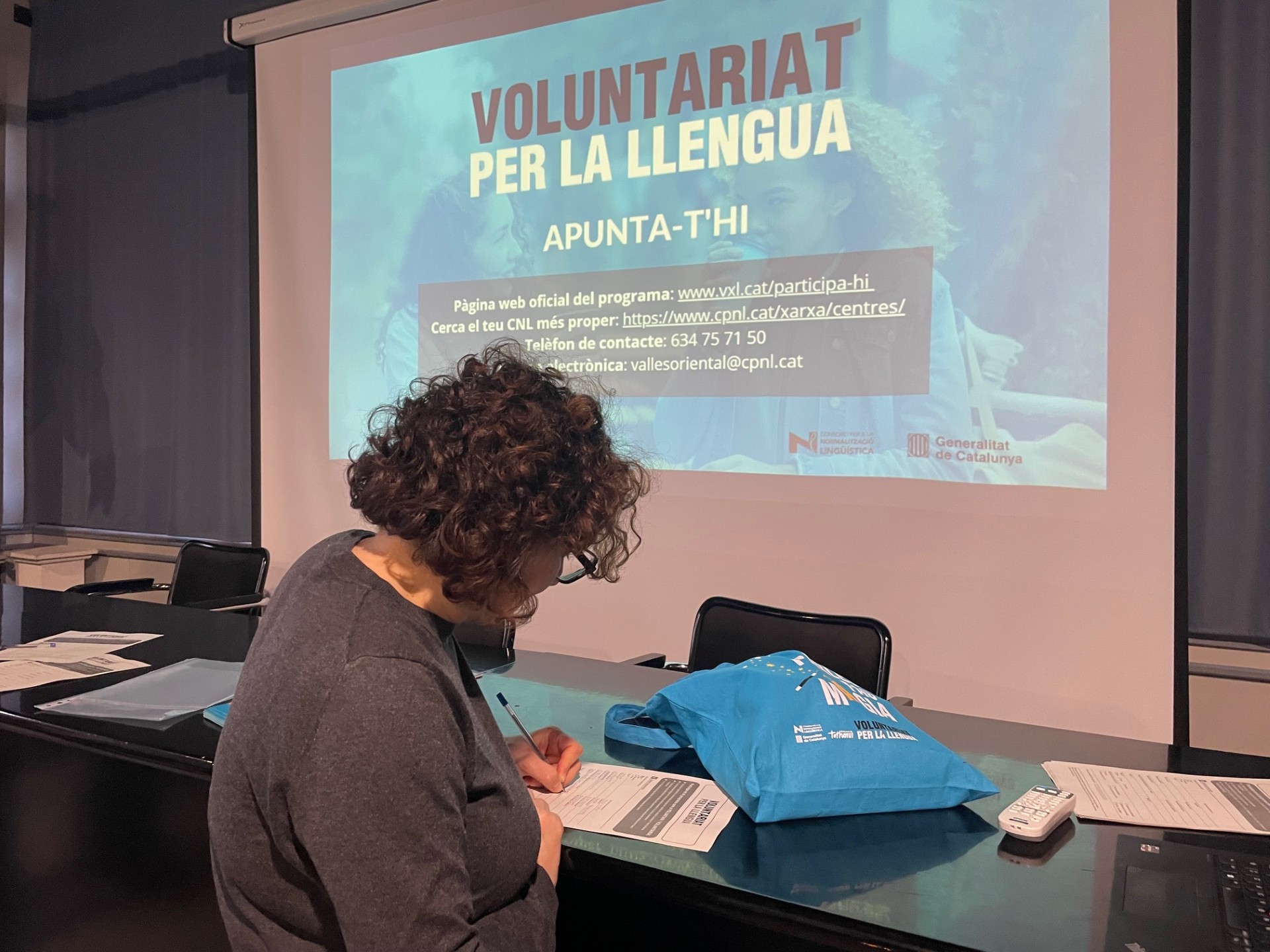 La presentació va anar a càrrec de dues tècniques del Servei Comarcal de Català del Vallès Oriental. Van presentar el Voluntariat per la llengua i van conversar amb els assistents, tant aprenents com voluntaris, sobre com ajudar les persones que volen aprendre català i els van animar a participar-hi. Finalment, es van repartir fitxes d’inscripció i força assistens s’hi van apuntar.